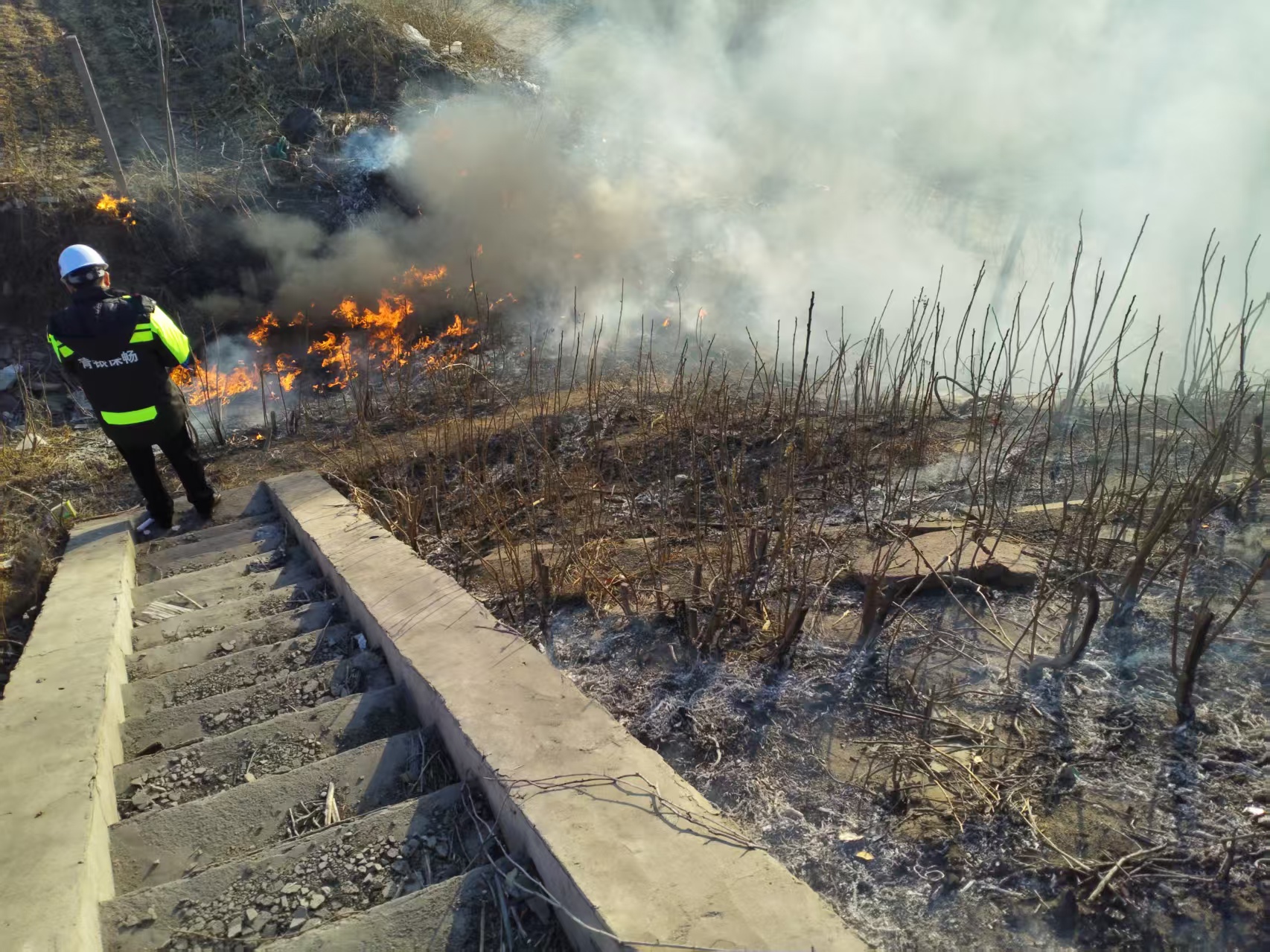 2月13日下午4時左右,石家莊保通保暢應(yīng)急大隊日常執(zhí)行巡邏任務(wù),當(dāng)行至青銀高速K609處時,隊員們發(fā)現(xiàn)邊溝處白煙滾滾,情況危急,周邊村民雖有心滅火,但因人力有限,滅火設(shè)備不足,只能干著急。