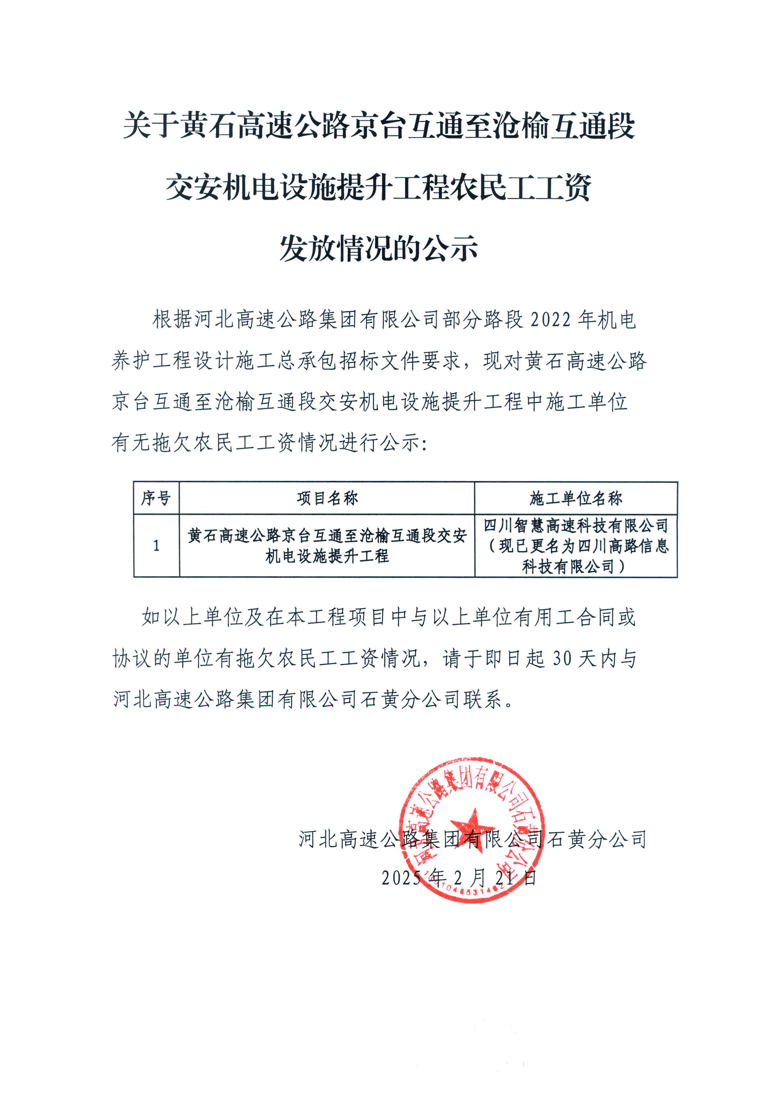關(guān)于黃石高速公路京臺(tái)互通至滄榆互通段交安機(jī)電設(shè)施提升工程農(nóng)民工工資發(fā)放情況的公示
