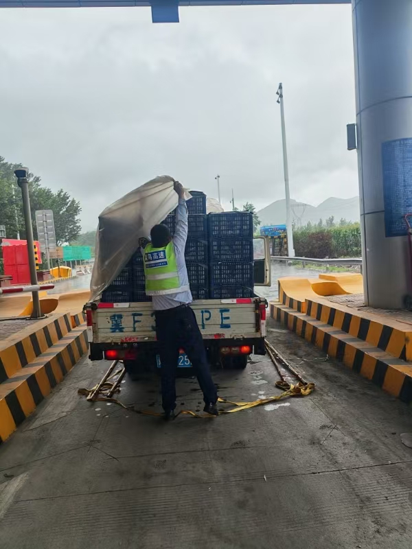 面對惡劣天氣,收費站工作人員與駕駛員通力協(xié)作,共同為貨廂實施防雨保護。駕駛員對收費站工作人員的援助深表感謝,表示此批鮮桃關系全家生計。經(jīng)過20分鐘的應急處置,農(nóng)產(chǎn)品安全得到有效保障。收費站工作人員隨后為駕駛員提供行車指引服務,確保車輛安全通行。