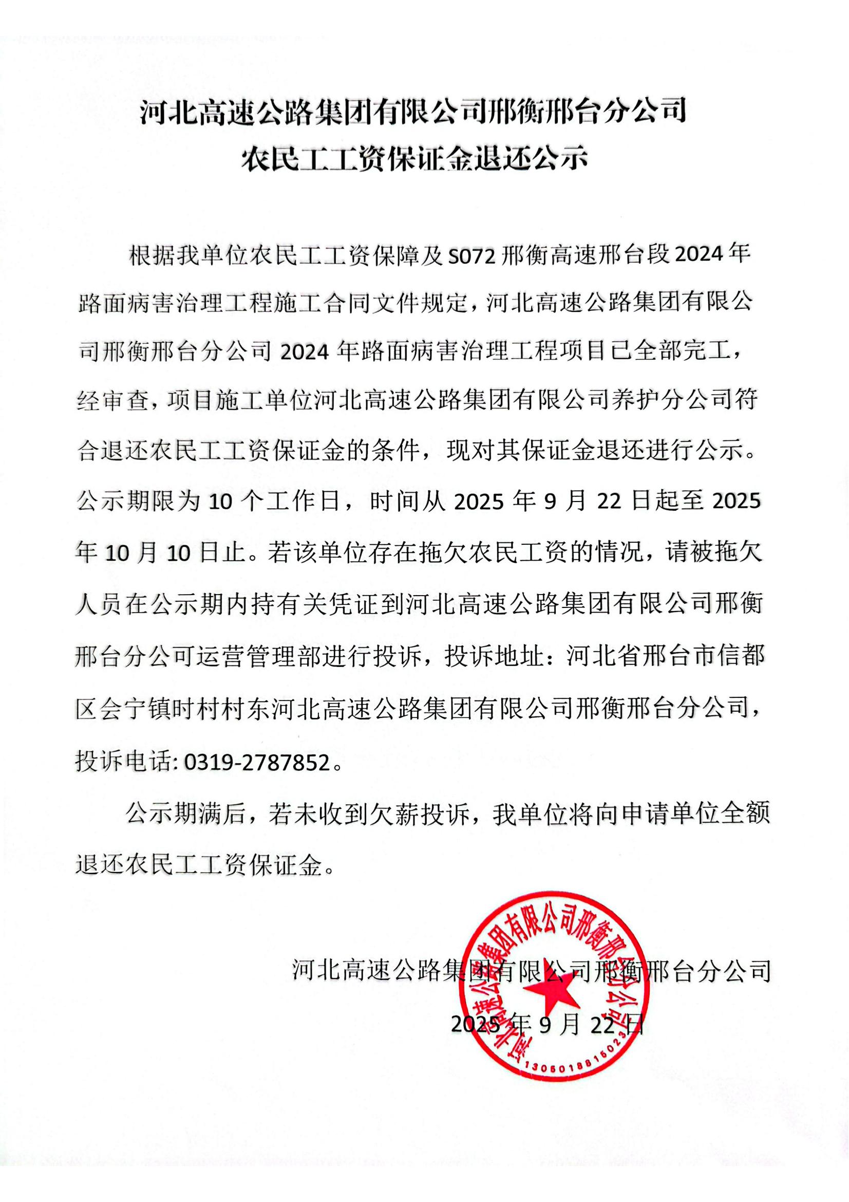 邢衡邢臺分公司農民工工資保證金退還公示(2024年路面病害治理工程)