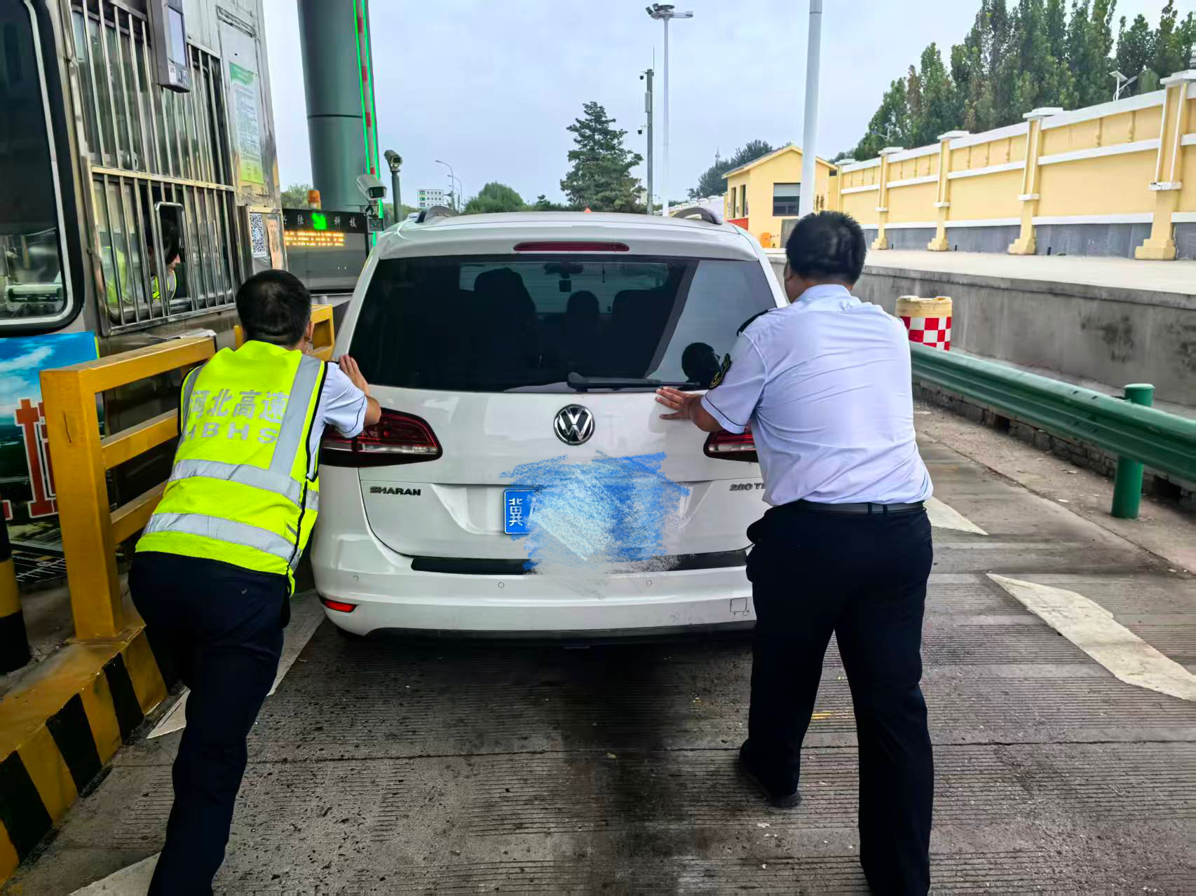 正在值守的收費(fèi)員第一時(shí)間發(fā)現(xiàn)異常,立即聯(lián)動(dòng)班長與備崗人員啟動(dòng)應(yīng)急處置。現(xiàn)場分工明確:一人迅速跑到來車方向,用標(biāo)準(zhǔn)手勢引導(dǎo)后方車輛減速避讓,筑起安全防線;另外兩人則快步上前,與焦急的司機(jī)合力將故障車推至不影響通行的安全區(qū)域。