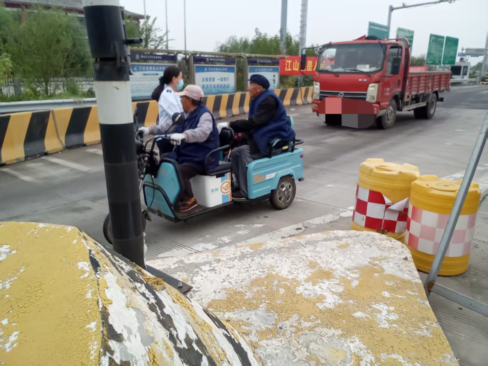 10月4日下午,當班疏導員在上道口廣場疏導,發(fā)現(xiàn)一輛藍色三輪車在往入口方向緩緩駛來,車上是兩位老人,疏導員見狀立即上前攔截并詢問。經(jīng)詢問得知,老人是附近村民,正準備騎著三輪車前往大興安定,聽說節(jié)假日走高速免費,就開著三輪車準備走高速。