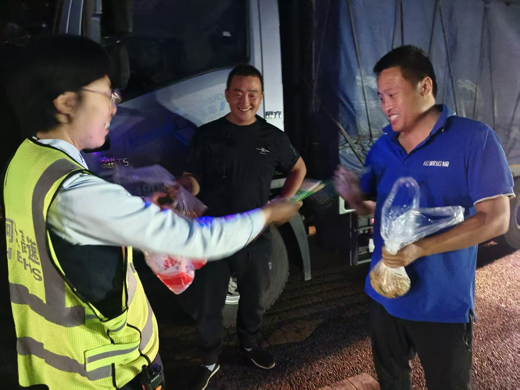 隨著夜色加深,部分滯留司乘面臨就餐、飲水等實(shí)際問題。值班站長巡查發(fā)現(xiàn)情況后,第一時(shí)間啟動(dòng)現(xiàn)場應(yīng)急保障機(jī)制,迅速組織工作人員籌備物資。班長冒雨打包熱飯菜、搬運(yùn)瓶裝水,在濕滑的地面上來回穿梭,逐車將溫暖與關(guān)懷送到司乘手中。當(dāng)熱氣騰騰的盒飯與清水被遞到車窗邊,許多司乘緊鎖的眉頭慢慢舒展,紛紛搖下車窗道謝,雨聲中的一句句“謝謝”格外真切。