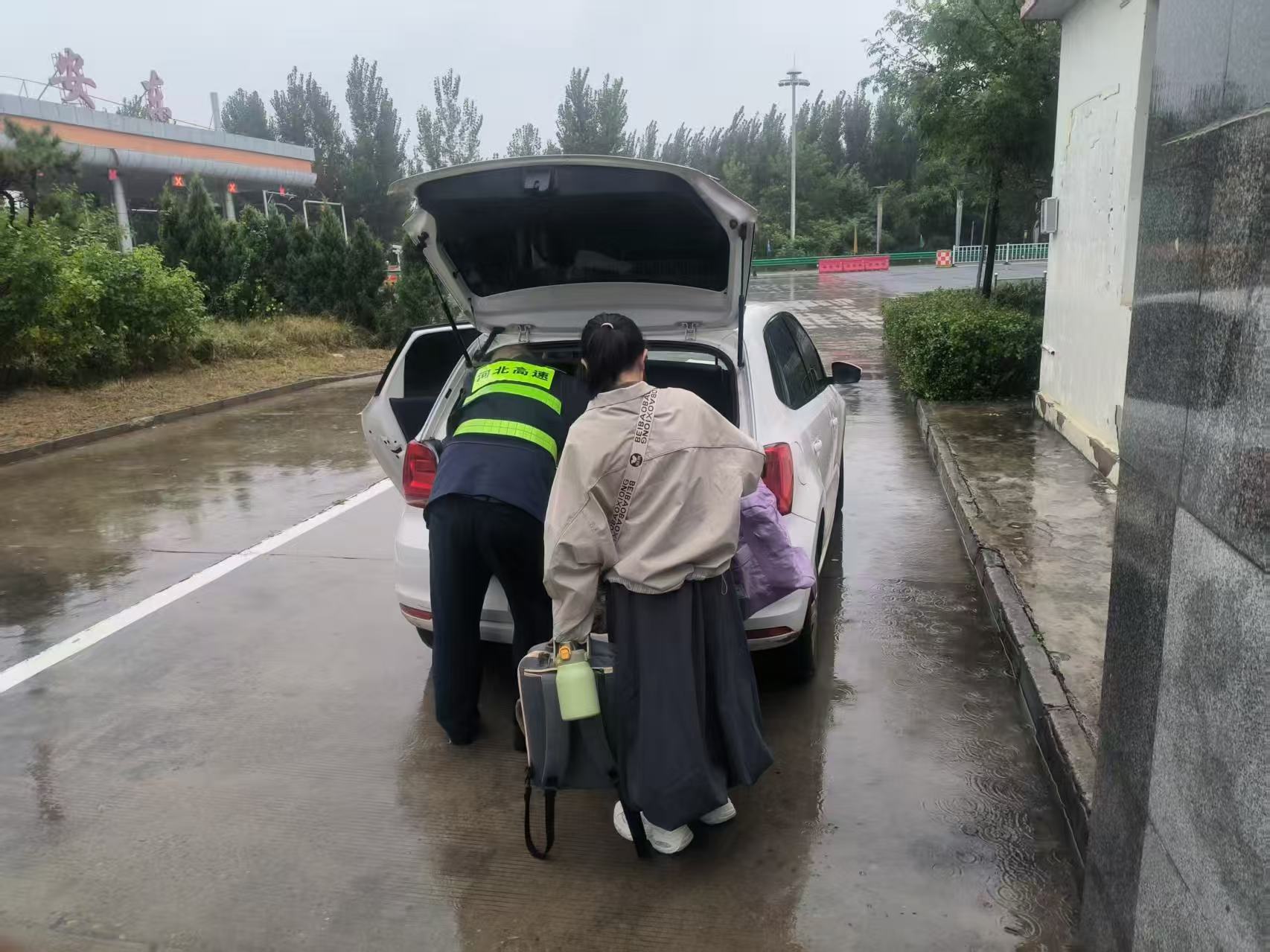 10月8日,國(guó)慶返程高峰遇上雨天,固安東收費(fèi)站的疏導(dǎo)員像往常一樣在廣場(chǎng)執(zhí)勤。他遠(yuǎn)遠(yuǎn)看到一名學(xué)生拖著行李,在高速口徘徊了很久。便主動(dòng)上前詢問(wèn)是否需要幫助。