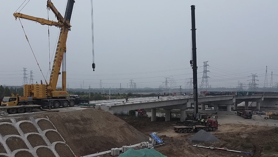 此次實現(xiàn)貫通的肥鄉(xiāng)西互通A匝道1號跨線橋,全長148米,結(jié)構(gòu)為單聯(lián)預(yù)應(yīng)力混凝土小箱梁,橋墩采用柱式墩結(jié)構(gòu)。該橋需上跨交通繁忙的國道G309,施工方采用“雙機跨外”的吊裝工藝,在確保下方國道通行不受影響的同時,高效完成了全部箱梁的架設(shè)任務(wù)。