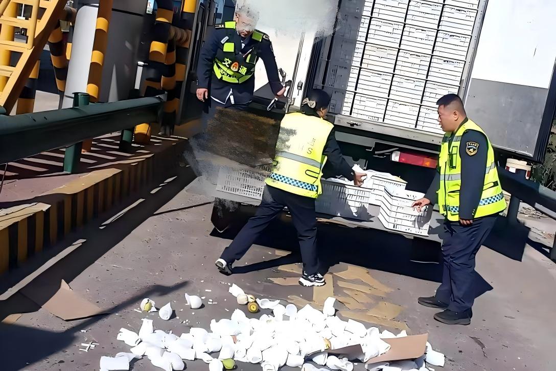 10月27日15時許,涿州南收費站驗貨人員正依規(guī)開展綠通車輛查驗工作。一輛滿載水果的貨車緩緩駛入驗貨區(qū),當班收費員按流程提示司機配合開箱檢查。不料,驗貨過程中因貨物裝載不穩(wěn),箱體突然傾斜倒塌,數十箱水果散落滿地。司機焦急萬分,試圖徒手扶正箱體,卻因貨物過重始終無法獨自應對,現(xiàn)場情況十分緊急。