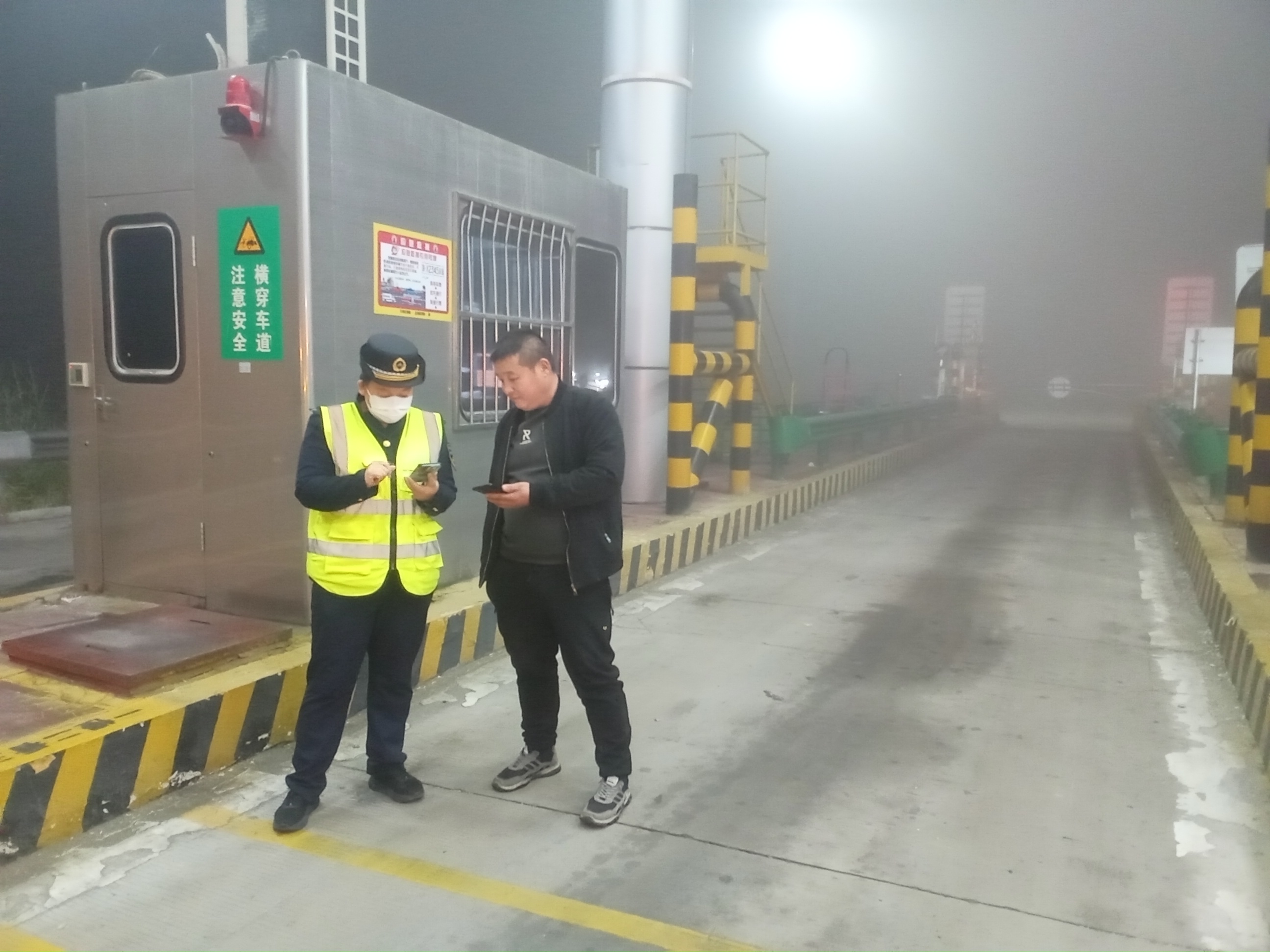 10月29日凌晨,大霧彌漫,正值收費(fèi)二班夜班期間,一輛滿(mǎn)載貨物的廂式貨車(chē)在濃霧中緩緩駛?cè)胧召M(fèi)廣場(chǎng),??渴召M(fèi)窗口后,司機(jī)向收費(fèi)員說(shuō)明車(chē)輛為綠通運(yùn)輸車(chē)輛,收費(fèi)員呼叫驗(yàn)貨員前來(lái)驗(yàn)貨。