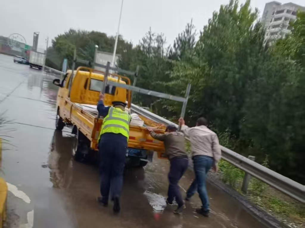 后方排隊(duì)的車(chē)輛漸漸多了起來(lái),雨刮器在車(chē)窗上不停擺動(dòng),偶爾響起的喇叭聲在雨幕中顯得格外急促。正在收費(fèi)亭外巡查的馮立斌早已注意到這邊的情況,他快步上前:“師傅,別慌,反復(fù)打火容易虧電,先歇會(huì)兒!”他俯身趴在車(chē)窗邊,大聲安撫陳師傅的情緒,仔細(xì)詢(xún)問(wèn)車(chē)輛故障情況。得知貨車(chē)是行駛途中突然熄火,重啟時(shí)出現(xiàn)打火故障,大概率是持續(xù)降雨導(dǎo)致電路受潮,馮立斌當(dāng)即說(shuō)道:“道口沒(méi)法長(zhǎng)時(shí)間停,我?guī)湍衍?chē)推到旁邊的安全區(qū)域,您再慢慢聯(lián)系維修,這樣也不影響后面的車(chē)通行!”