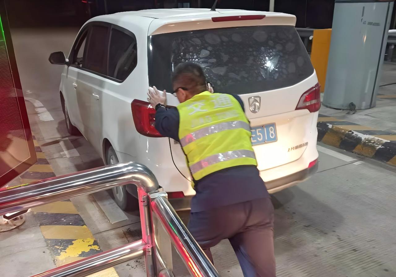 當晚22時,一輛白色小轎車完成繳費后,繳費桿抬起,車輛卻遲遲未能向前行駛。正在崗亭內操作的收費員立即起身查看,發(fā)現(xiàn)車主反復轉動鑰匙,發(fā)動機卻毫無反應,車輛穩(wěn)穩(wěn)停在車道中央 —— 顯然是突發(fā)故障。此時,后方已有兩輛車輛排隊等候,若不及時處理,不僅會造成車道擁堵,夜間視線不佳的情況下還可能引發(fā)剮蹭事故。收費員通過對講機向班長緊急匯報,班長立即引導后方車輛減速,并示意其暫時切換至相鄰車道通行。