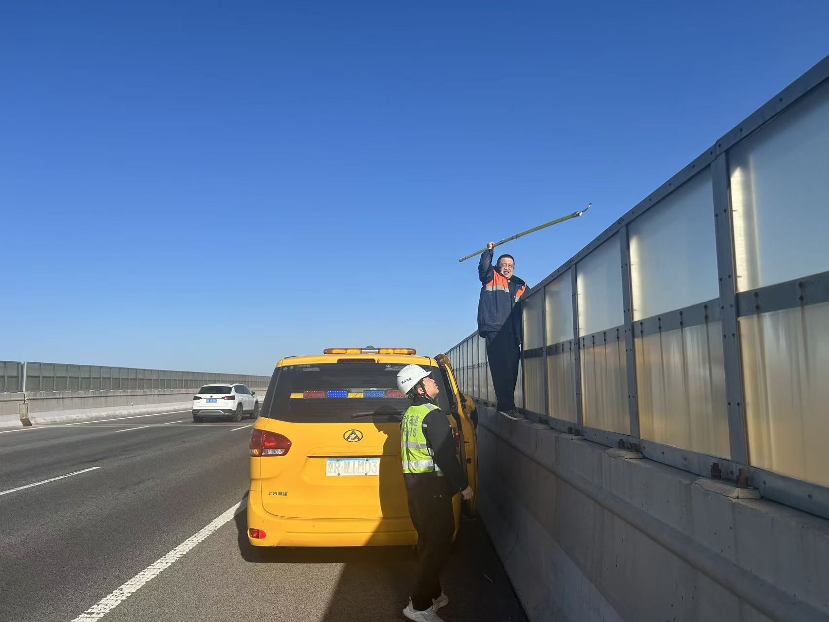 到達(dá)現(xiàn)場(chǎng)后,雙方立刻摸排異物具體位置。由于護(hù)欄上方設(shè)置了防拋屏,對(duì)排查和清理帶來了一定的困難,但雙方憑借多年的工作經(jīng)驗(yàn),迅速制定出了解決方案。隨后異物被成功清理,隱患消除,高速公路和鐵路恢復(fù)正常運(yùn)行,整個(gè)過程僅用時(shí)不到40分鐘。