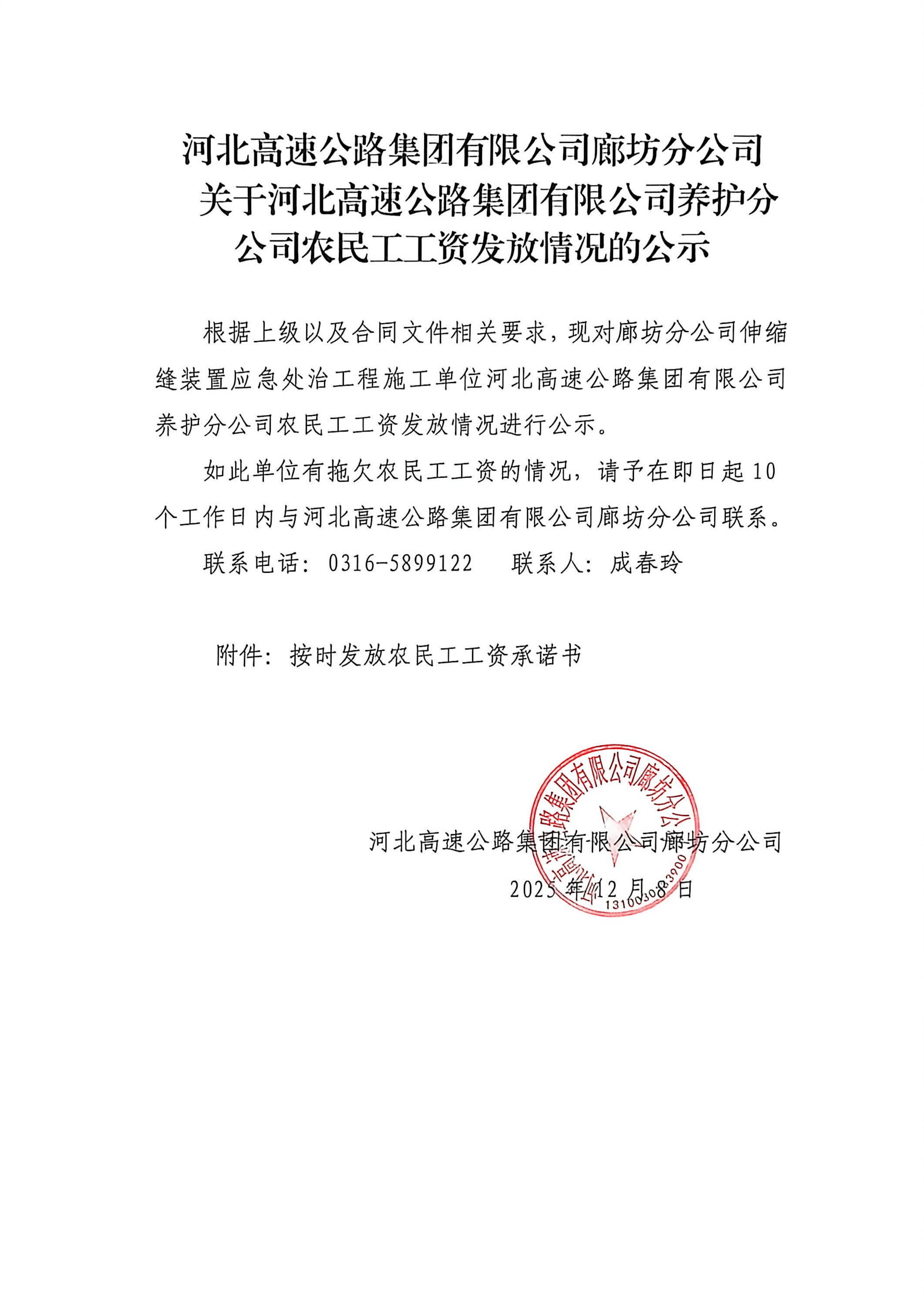 關(guān)于河北高速公路集團(tuán)有限公司養(yǎng)護(hù)分公司農(nóng)民工工資發(fā)放情況的公示