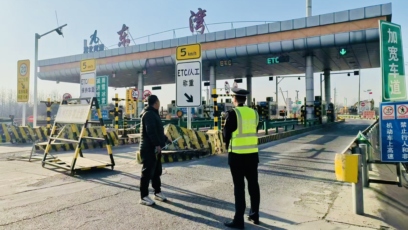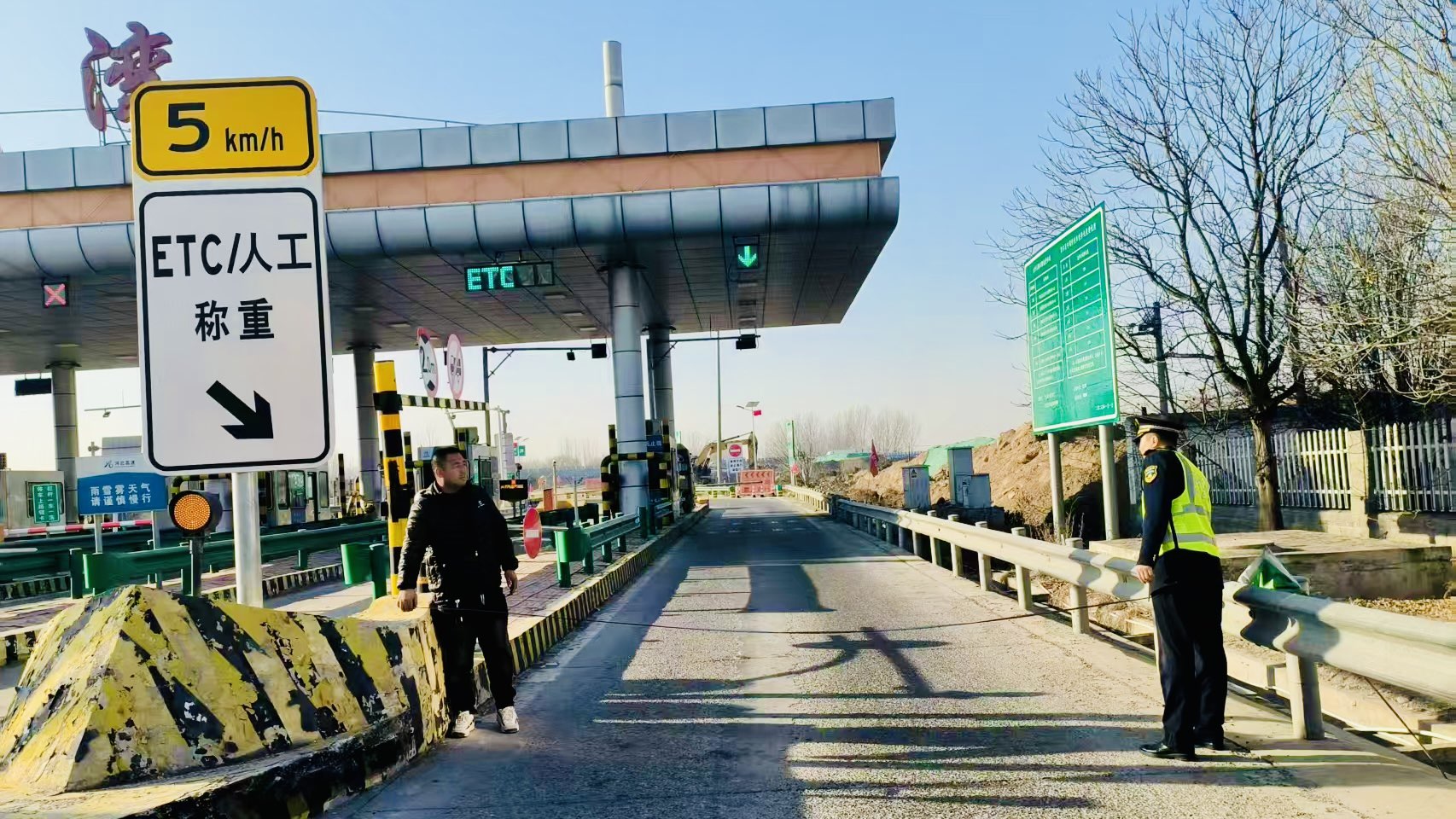 12月10日上午,一輛大件運(yùn)輸車緩緩駛近東灣收費(fèi)站。司機(jī)因擔(dān)心車輛超寬無(wú)法安全通過(guò),向工作人員求助測(cè)量車道寬度。
