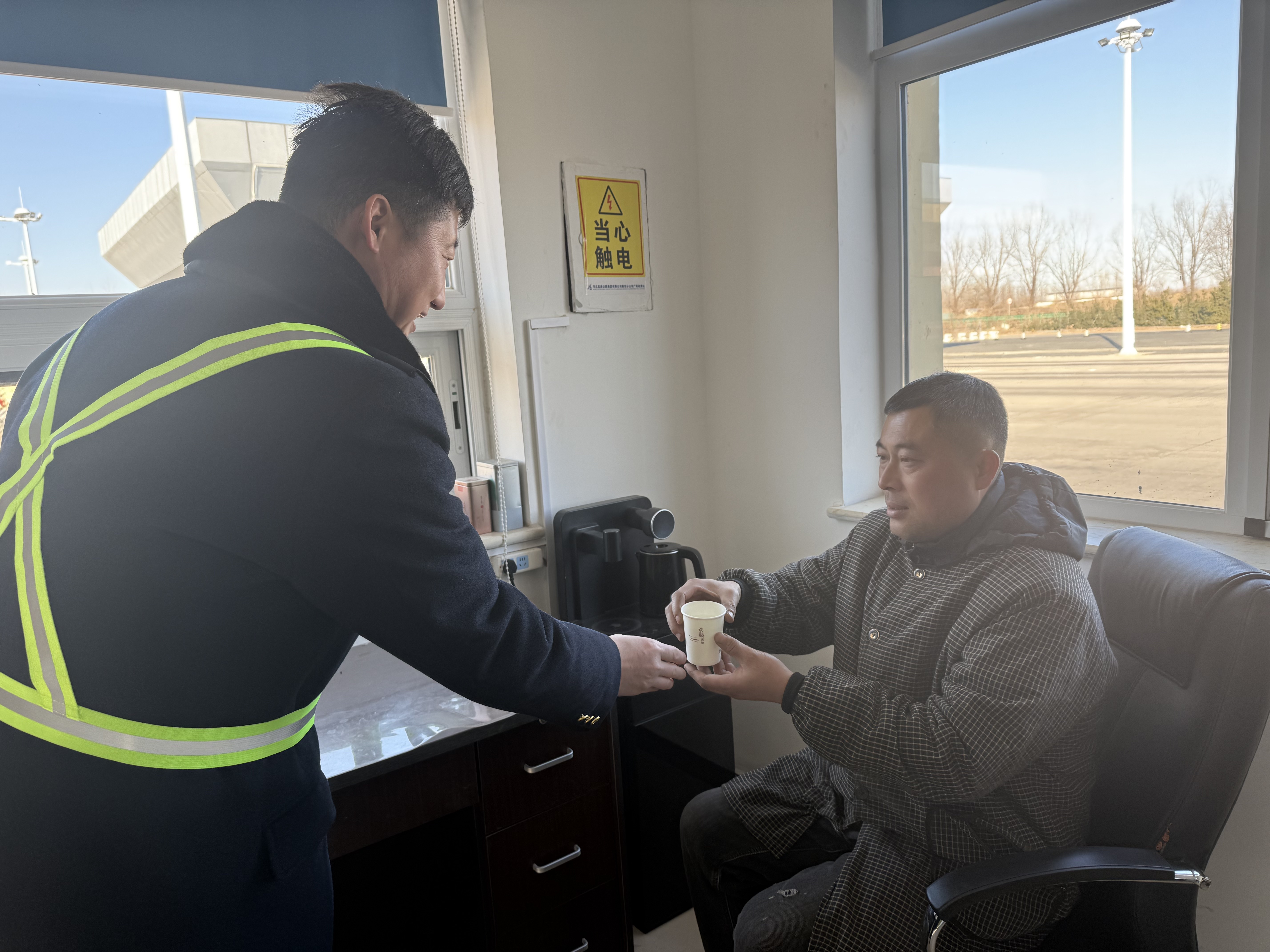 正在現(xiàn)場執(zhí)勤的當(dāng)班班長發(fā)現(xiàn)情況后,第一時(shí)間上前詢問具體情況。在得知車輛報(bào)警無法正常行駛后,他主動(dòng)協(xié)助司機(jī)打開車輛前機(jī)器蓋,拔出機(jī)油尺仔細(xì)檢查,快速判斷出故障原因?yàn)檐囕v機(jī)油不足??紤]到天氣寒冷,班長一邊安撫司機(jī)焦急的情緒,引導(dǎo)其前往值班室休息取暖,并貼心送上熱水;一邊迅速聯(lián)系附近的修理廠,詳細(xì)說明車輛故障情況與具體位置,協(xié)調(diào)救援人員趕赴現(xiàn)場。