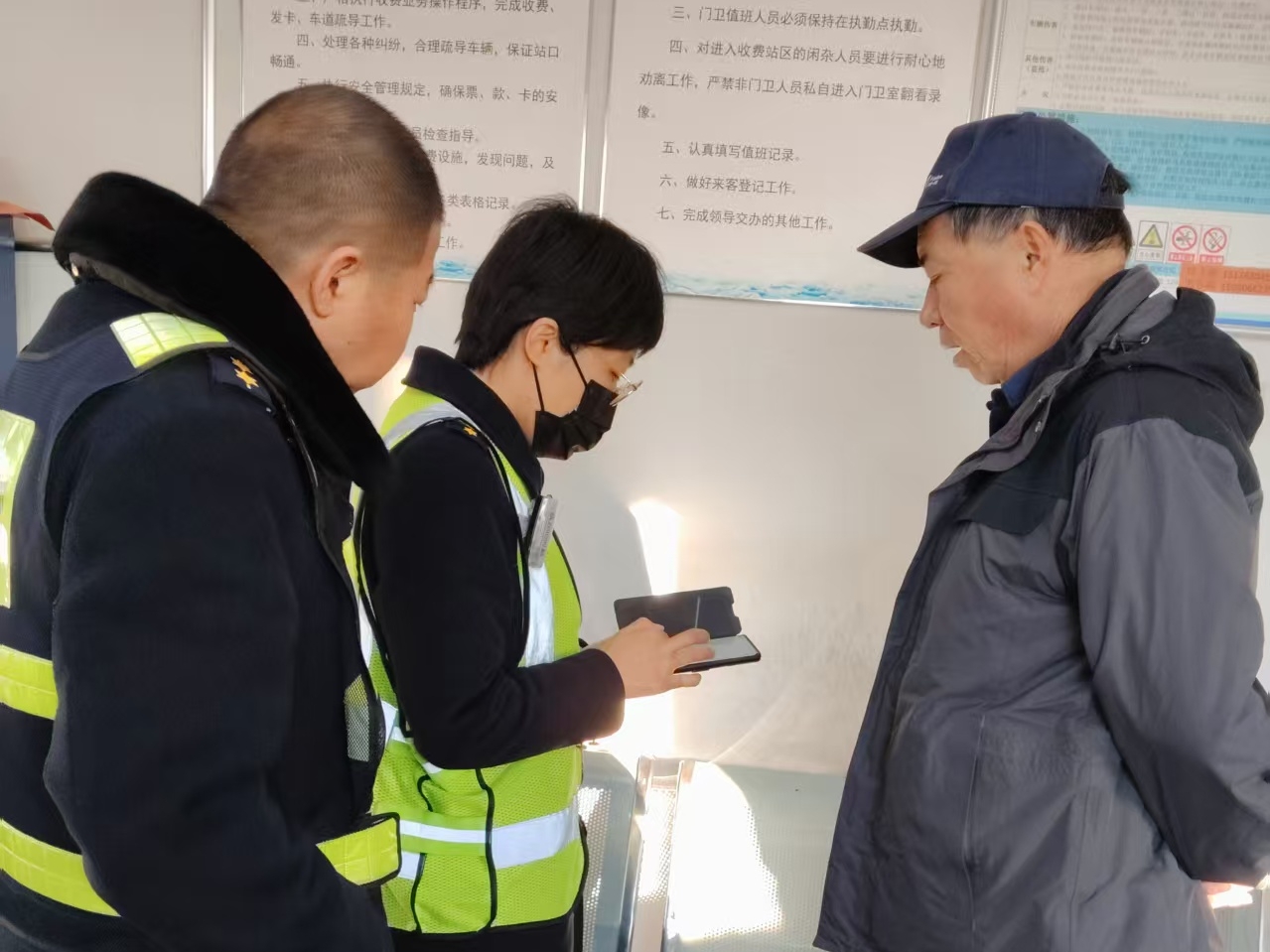 經(jīng)了解,該司乘要前往北京,卻對(duì)當(dāng)?shù)毓步煌肪€一無(wú)所知,眼看行程臨近,一時(shí)沒了頭緒。收費(fèi)班長(zhǎng)一邊安撫其情緒,一邊快速查詢最優(yōu)乘車方案,告知他乘車點(diǎn)就在收費(fèi)站附近,步行僅需幾分鐘??紤]到公交還要一段時(shí)間才到站,且戶外天氣偏冷,工作人員熱情邀請(qǐng)司乘到站內(nèi)門衛(wèi)室休息等候,并遞上熱水。