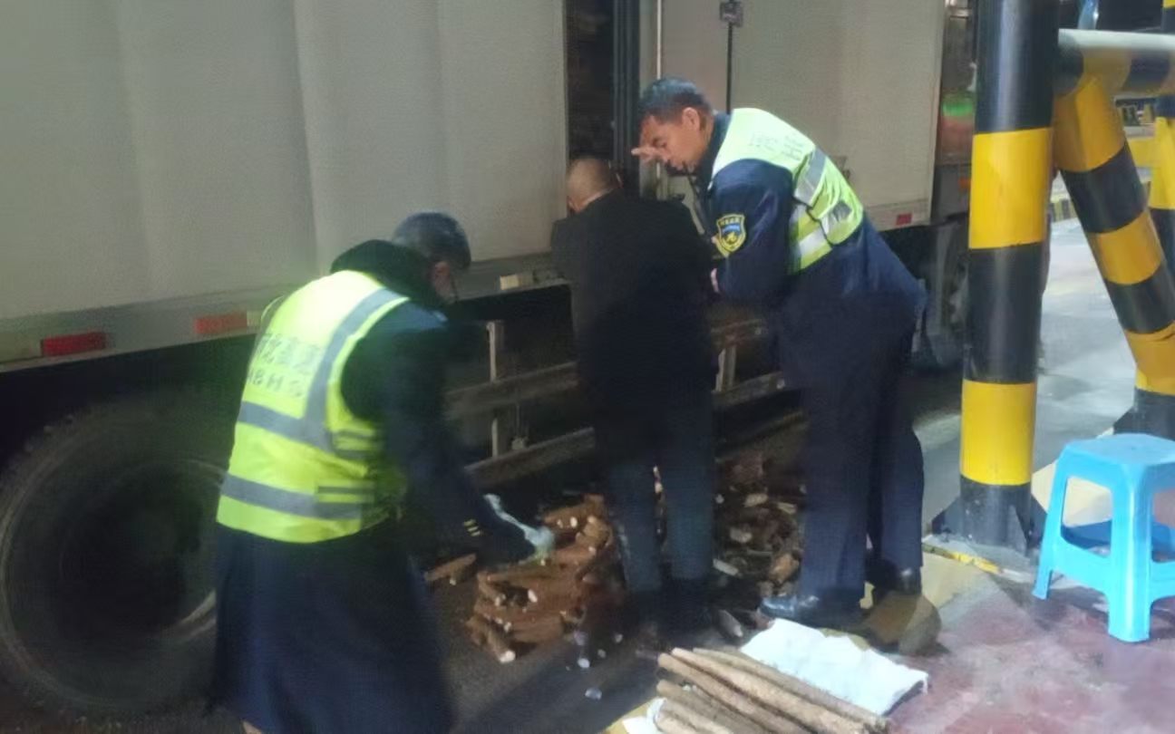 2月4日凌晨5時(shí)13分,王師傅駕駛滿載山藥的貨車駛?cè)胂愫游魇召M(fèi)站綠通查驗(yàn)通道,工作人員按規(guī)定開(kāi)始查驗(yàn)流程。不料,車門打開(kāi)過(guò)程中,數(shù)十斤山藥順著車廂邊緣滾落,散落在車道內(nèi)。王師傅見(jiàn)狀瞬間慌了神,一邊擔(dān)心貨物受損,一邊害怕影響車道通行,急得手足無(wú)措。