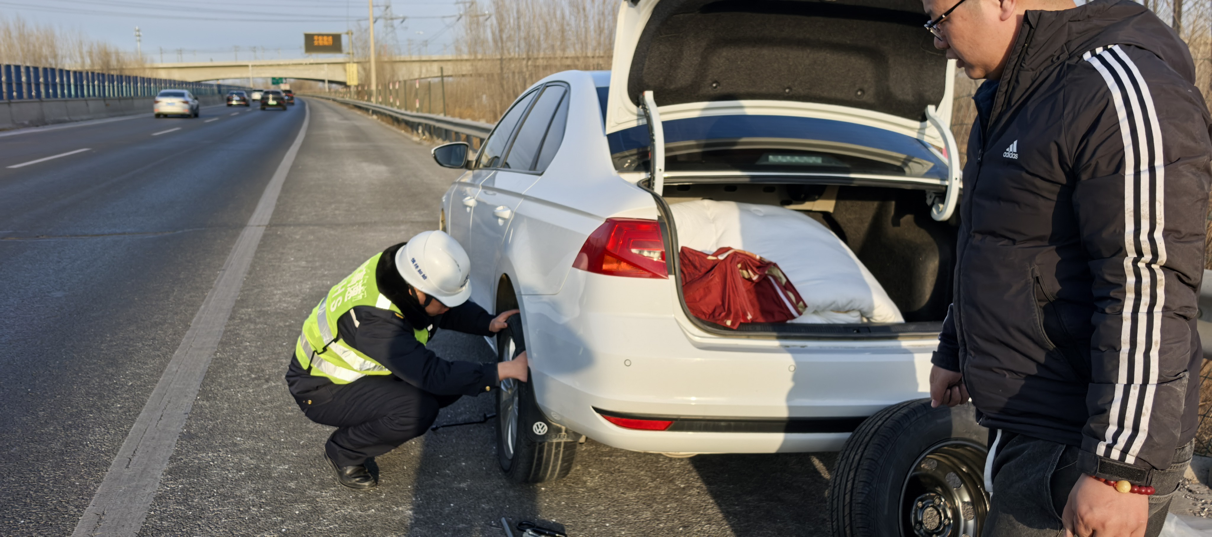 2月6日,廣陽(yáng)保通保暢應(yīng)急大隊(duì)隊(duì)員在日常巡查至密云方向K250+900處時(shí),發(fā)現(xiàn)一輛白色私家車因右后輪爆胎,緊急??吭趹?yīng)急車道。駕駛員站在故障車旁,面對(duì)已經(jīng)卸下螺母卻卡死無(wú)法取下的故障輪胎,顯得束手無(wú)策。