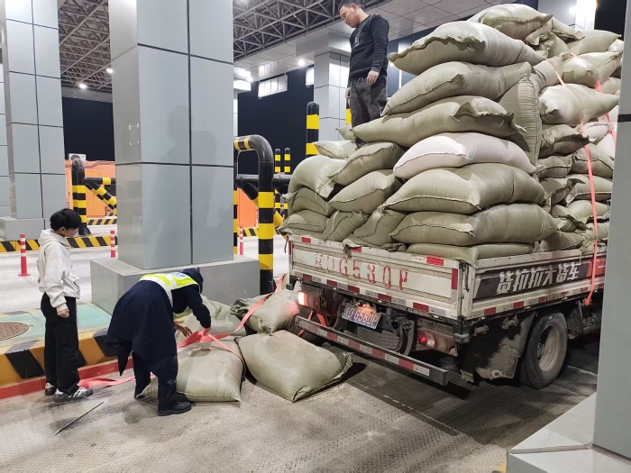 見此情景,當(dāng)班收費(fèi)員杜彥彥立即來到車道,擺放好安全錐做好安全提示,將其他車輛疏導(dǎo)至其它車道通行。隨后,她一邊安慰司機(jī)一邊叫來當(dāng)班其它人員。在冬日的寒風(fēng)里,大家齊心協(xié)力,共同把散落的貨物裝起并固定好,司機(jī)師傅連連道謝后安全駛離。