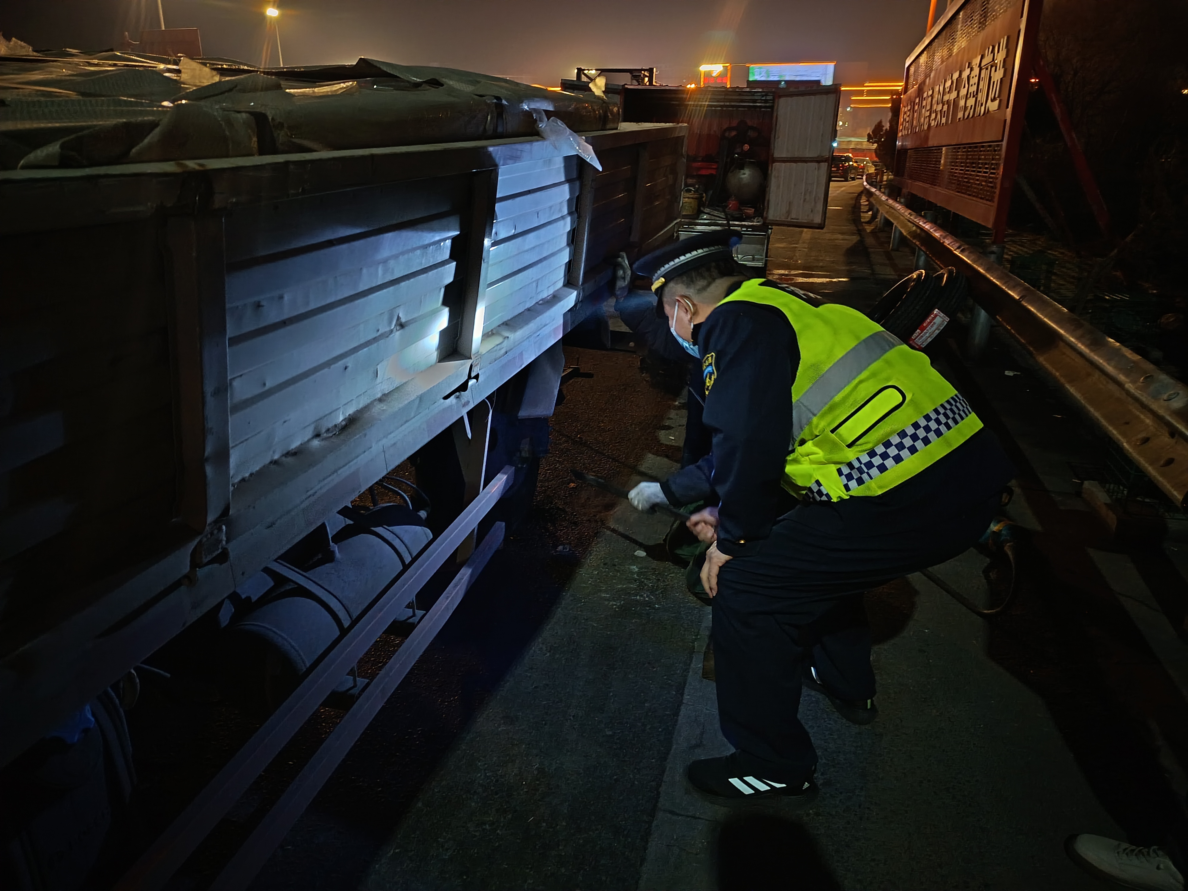 2月24日晚上十點半左右,一輛藍牌貨車駛?cè)肭嗫h收費站,正在廣場疏導車輛的班長張玉松發(fā)現(xiàn)該車右后側(cè)輪胎完全癟了,立即上前提醒駕駛員。駕駛員表示他正是發(fā)現(xiàn)車輛爆胎,才趕緊下高速來修車。