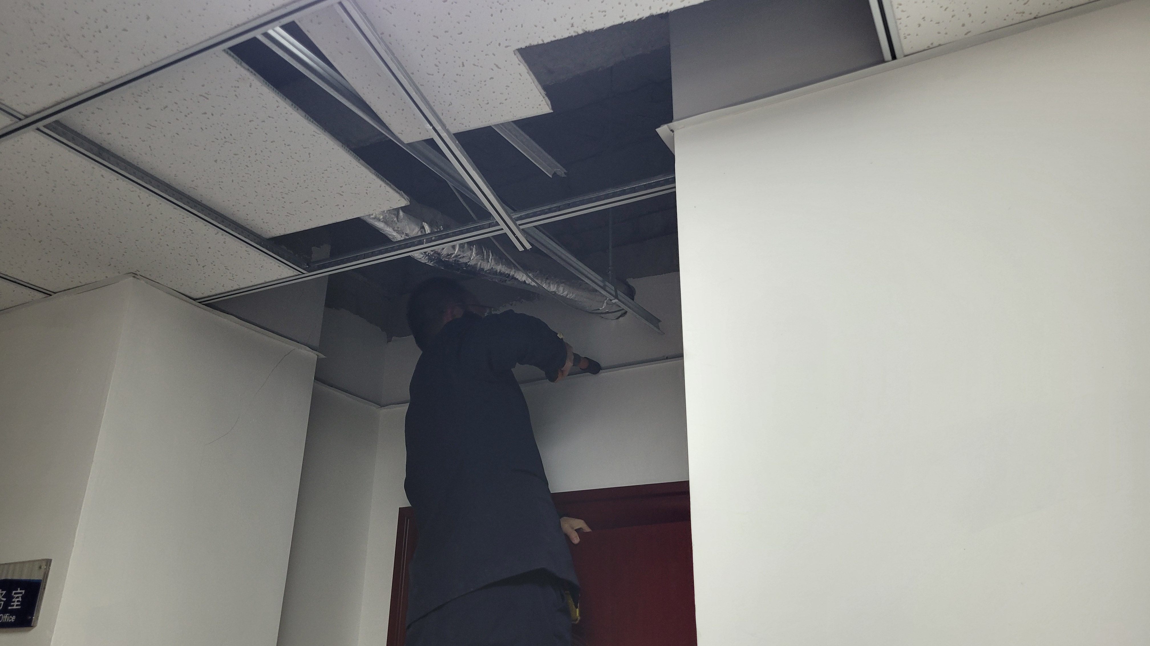 維修過程中,大家分工協(xié)作,配合默契,有的職工仔細(xì)勘察龍骨結(jié)構(gòu),測量尺寸,規(guī)劃修復(fù)方案,有的職工迅速清點庫存,找來同規(guī)格天花板、龍骨、螺絲等材料。大家規(guī)范操作,細(xì)心拆除破損吊頂、固定龍骨、安裝新板材,全程規(guī)范有序。經(jīng)過近一個小時的緊張忙碌,脫落天花板位置房頂順利修復(fù),安全隱患被徹底排除。