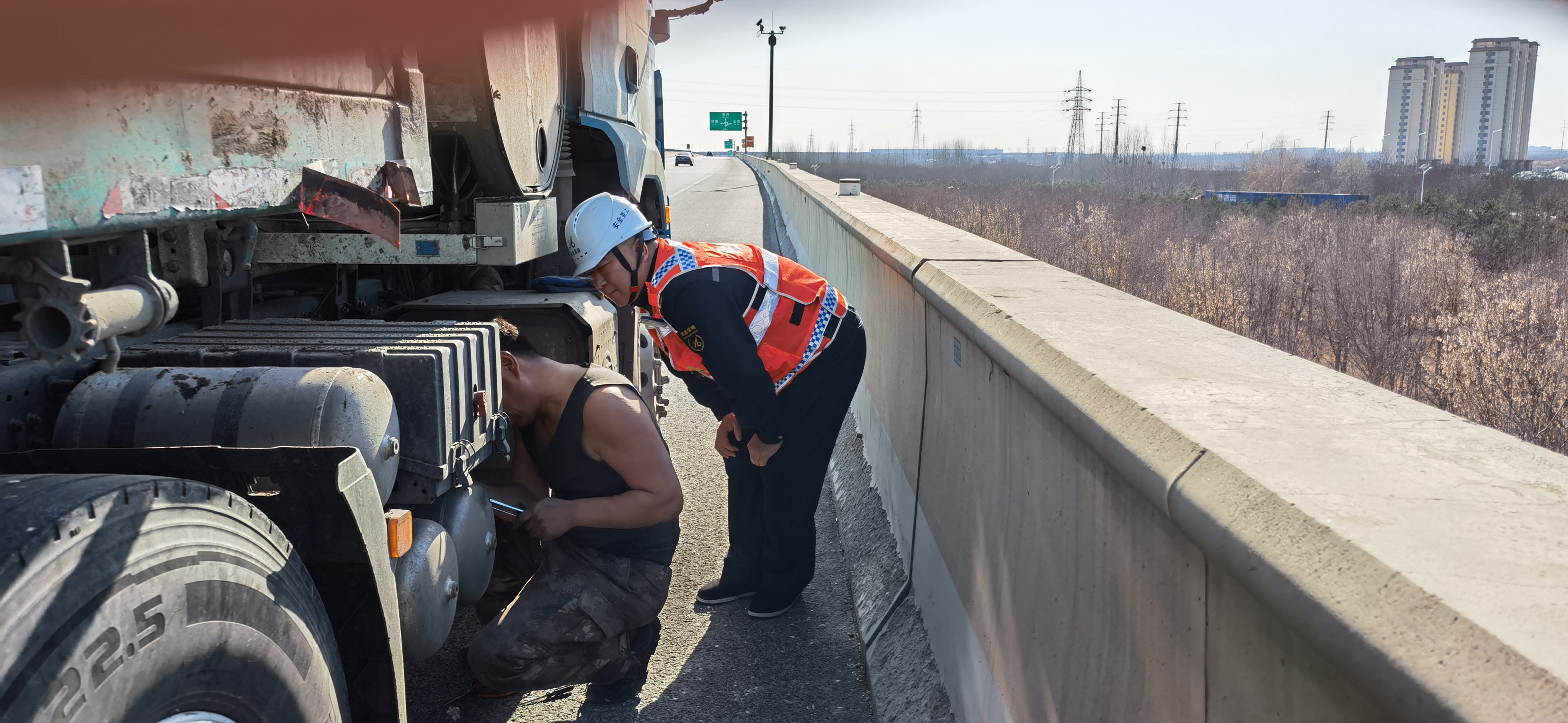 隨后,他們迅速下車,快速且規(guī)范地擺好防護(hù)錐桶,同時協(xié)助司機(jī)排查故障并進(jìn)行搶修。他們密切關(guān)注過往車輛的行駛動態(tài),在現(xiàn)場進(jìn)行預(yù)警指揮,全力保障故障貨車搶修現(xiàn)場的安全。在劉偉科和呂清海的協(xié)助下,司機(jī)很快完成了搶修工作,貨車駛離現(xiàn)場,道路恢復(fù)了暢通。