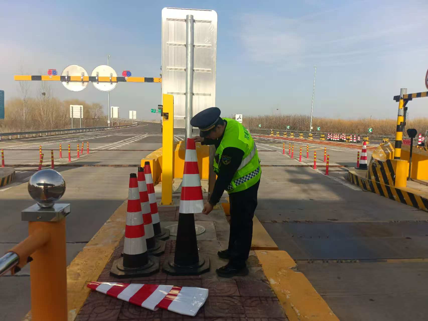 當(dāng)班班長第一時間向值班站長匯報情況,并快速組織班組人員籌備全新反光錐及相關(guān)安全警示器材。作業(yè)前,工作人員嚴格遵照安全作業(yè)規(guī)范,清晰劃分作業(yè)區(qū)域與行車區(qū)域,全力保障更換過程中人員與車輛安全。隨后,班長帶領(lǐng)班組人員分工協(xié)作、密切配合,對全站所有車道及廣場區(qū)域的反光錐進行逐一排查,將破損、反光效果不達標的錐桶統(tǒng)一更換。全新反光錐按標準間距整齊擺放,清晰醒目,切實發(fā)揮出車道隔離、安全警示的關(guān)鍵作用。