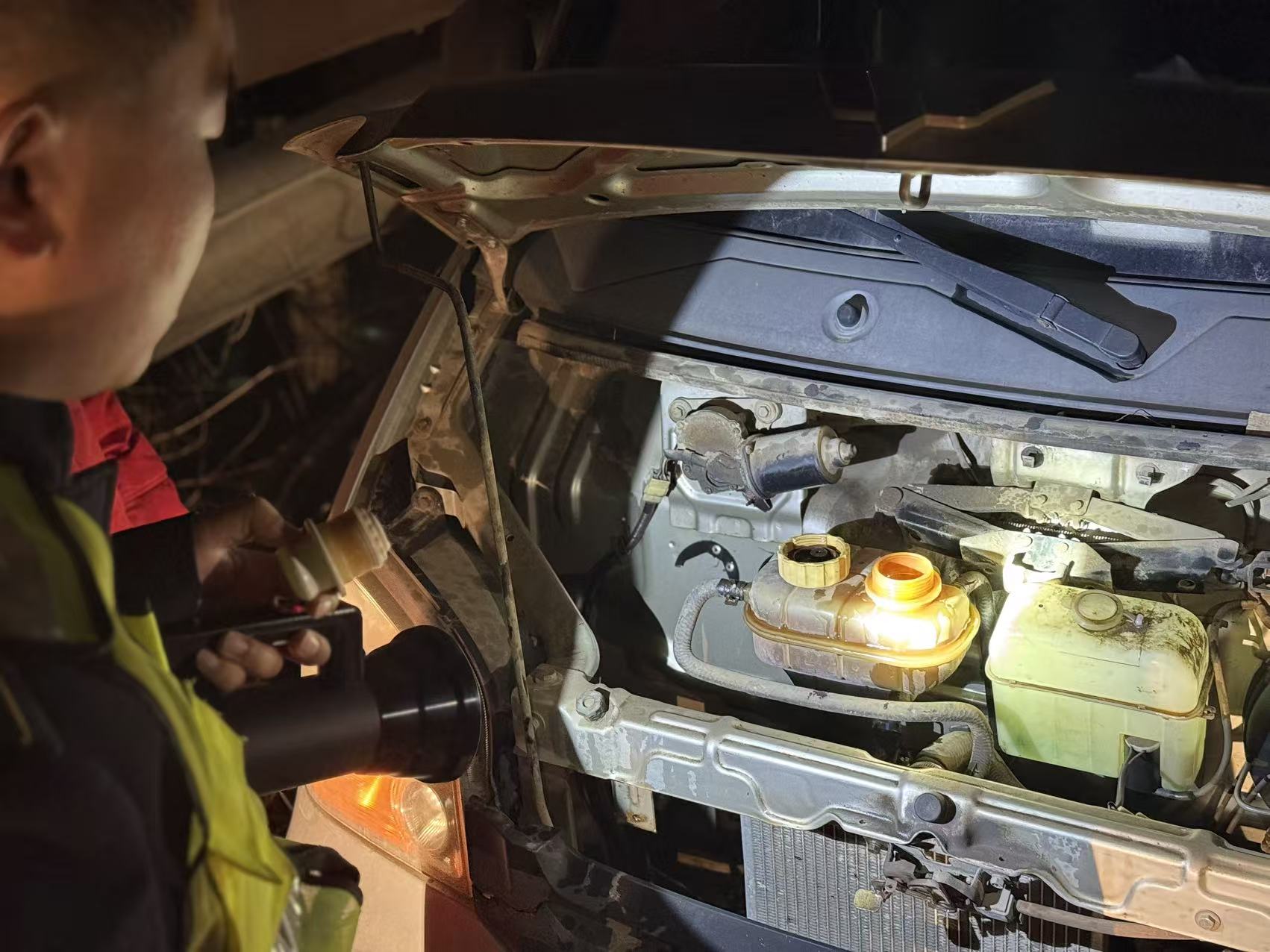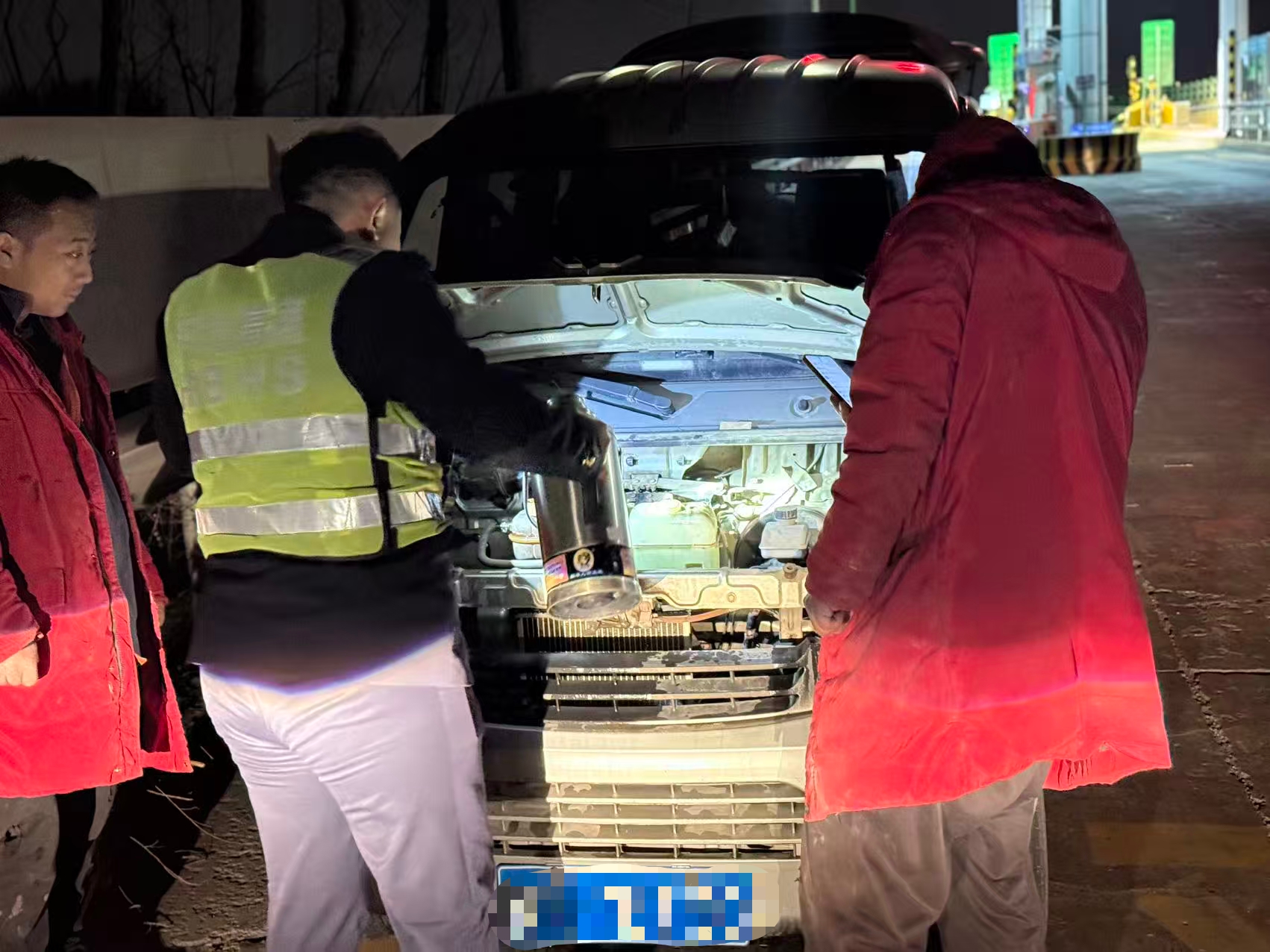 班長聞訊火速趕赴現(xiàn)場,憑借豐富實操經(jīng)驗快速判斷為車輛冷卻液不足導(dǎo)致過熱。他當即啟用收費站應(yīng)急物資庫,精準取用冷卻液為車輛緊急加注。在故障排除的關(guān)鍵時刻,工作人員全程守護司機安全,協(xié)助聯(lián)系就近修理廠,全程跟進車輛檢修進度,直至確認車輛狀態(tài)穩(wěn)定。