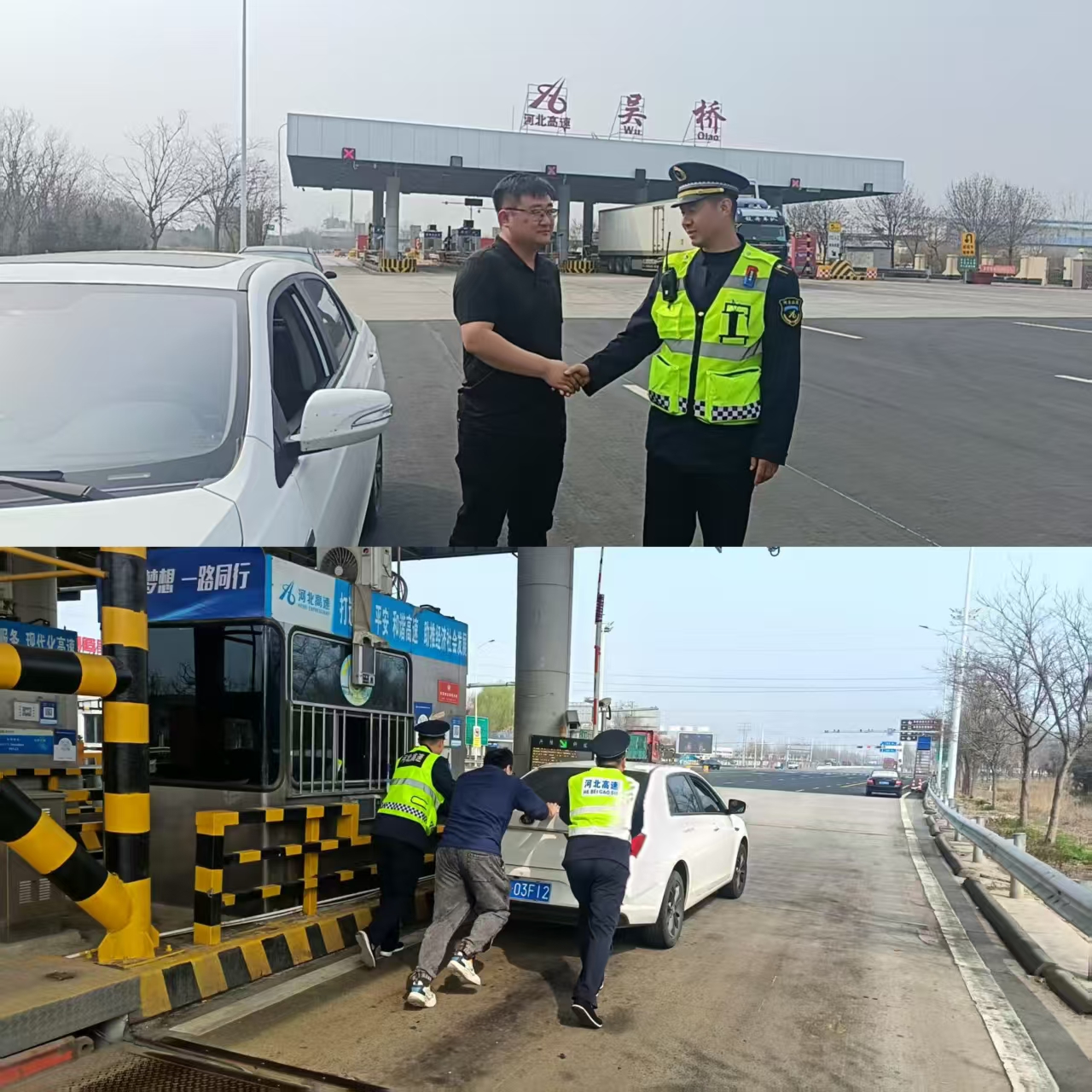 面對司機的困境,當(dāng)班班長沒有片刻猶豫,迅速上前對車輛檢查,在確定車輛故障無法在短時間內(nèi)排除后,“師傅您會推車打火嗎?”在得到司機肯定的答復(fù)后,班長立即與其他工作人員齊心協(xié)力將車輛推至收費站外廣場安全區(qū)域,并在來車方向設(shè)置警示標(biāo)識,對過往車輛進行臨時攔截,引導(dǎo)車流有序避讓,為故障車輛開辟出一條安全的推車通道。