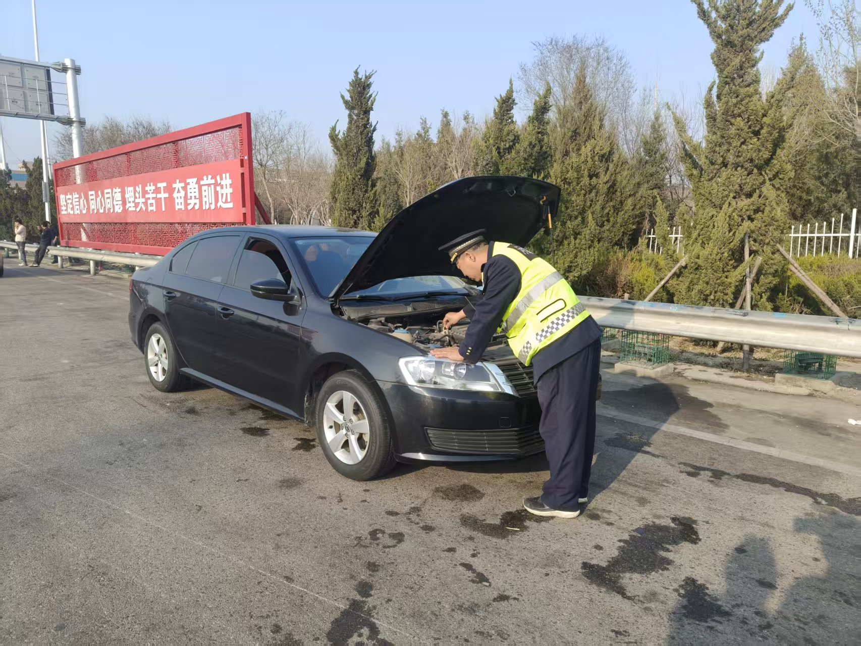 當(dāng)日下午,一輛黑色轎車突然在車道內(nèi)熄火。司機(jī)多次嘗試重啟車輛都沒有成功。當(dāng)班班長黃汝亮發(fā)現(xiàn)后,立即叫來班里收費(fèi)員一同將車輛推到外廣場(chǎng)安全區(qū)域靠邊停放。隨后,他主動(dòng)協(xié)助司機(jī)排查車輛故障原因,初步判定是電瓶虧電導(dǎo)致的無法啟動(dòng)。