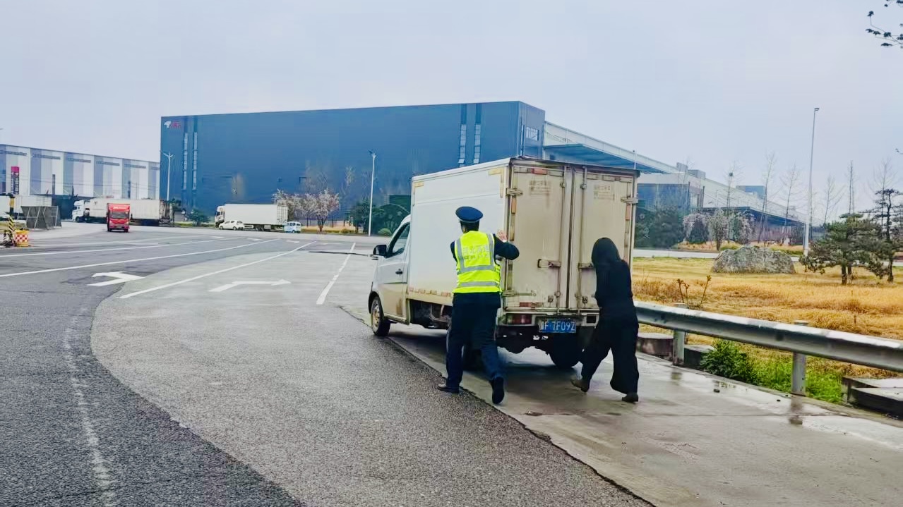 當時,該車完成繳費后突然熄火,多次嘗試啟動無果?,F(xiàn)場收費人員發(fā)現(xiàn)后,第一時間暫停該車道收費操作,上前安撫司機情緒并迅速排查,初步判斷為發(fā)動機線路小故障。為避免影響通行,工作人員分工協(xié)作,一邊在車后做好安全警示、引導后續(xù)車輛繞行,一邊合力將故障車推至收費站外安全區(qū)域,消除隱患。