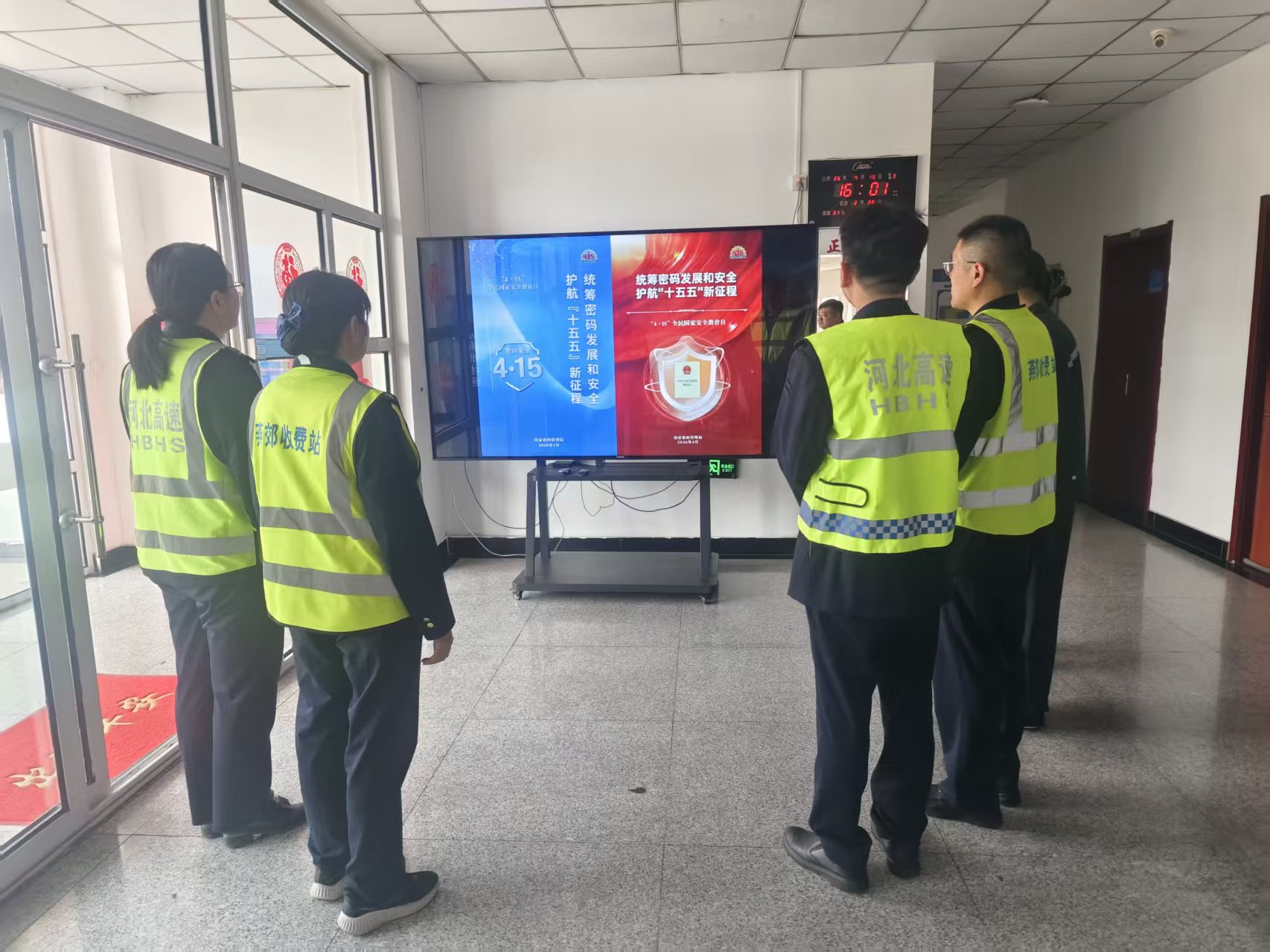 活動以“學(xué)深悟透強根基”為首要環(huán)節(jié),組織全體職工開展專題學(xué)習(xí)會。通過原文學(xué)習(xí)、案例解讀、交流研討等形式,重點解讀《中華人民共和國國家安全法》核心要義,明確政治安全、網(wǎng)絡(luò)安全、交通設(shè)施安全等重點領(lǐng)域防護要求;同步深入學(xué)習(xí)《中華人民共和國密碼法》,闡釋密碼分類管理、商用密碼應(yīng)用等關(guān)鍵條款,結(jié)合收費場景強調(diào)數(shù)據(jù)安全與信息保密規(guī)范,引導(dǎo)職工筑牢思想防線;同時利用辦公區(qū)電子屏循環(huán)播放主題宣傳片、微動漫,在宣傳欄張貼法規(guī)解讀海報,營造“人人學(xué)安全、人人講安全”的濃厚氛圍,破除“國家安全與己無關(guān)”的認知誤區(qū)。 為實現(xiàn)“以學(xué)促用、以用踐安”,活動結(jié)束后燕郊收費站開展了安全隱患專項排查,聚焦收費系統(tǒng)數(shù)據(jù)管理、機電設(shè)備運行、現(xiàn)場反恐防暴等關(guān)鍵環(huán)節(jié),全面排查整改風(fēng)險隱患,提升職工應(yīng)對突發(fā)情況的能力,切實把安全責(zé)任落實到崗位、融入日常。
