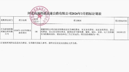 2026-03-24 08:51:56河北高速邯港高速公路有限公司2026年-2027年物業(yè)服務(wù)項目 招標(biāo)公告 1.招標(biāo)條件 本招標(biāo)項目河北高速邯港高速公路有限公司2026年-2027年物業(yè)服務(wù)項目已列入河北高速邯港高速公路有限公司2026年度預(yù)算,項目業(yè)主單位為...[詳細]