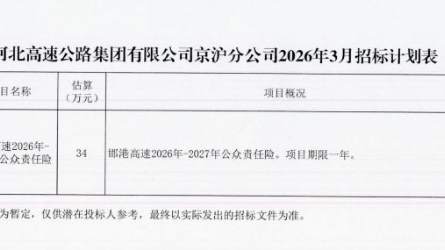 2026-04-10 08:49:50邯港高速(滄州段)一期2026年-2027年公眾責(zé)任險項目 招標(biāo)公告 1.招標(biāo)條件 本招標(biāo)項目邯港高速(滄州段)一期2026年-2027年公眾責(zé)任險項目(以下簡稱“本項目”)已由河北高速公路集團有限公司京滬分公司確認。項目...[詳細]