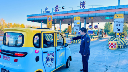 一輛老年代步車駛?cè)霒|灣收費(fèi)站入口方向,當(dāng)班收費(fèi)員見狀連忙跑上前,揮手將其截停,同時(shí),告知駕駛員非機(jī)動車禁止行駛高速公路。[詳細(xì)]