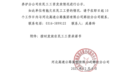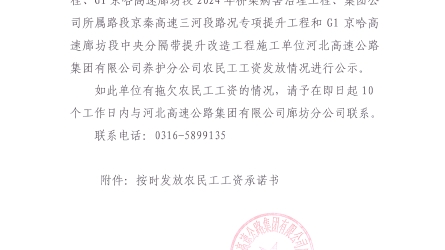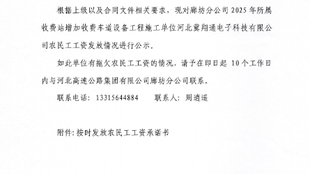 河北高速公路集團(tuán)有限公司廊坊分公司關(guān)于河北冀翔通電子科技有限公司2024年機(jī)電設(shè)施改造工程農(nóng)民工工資發(fā)放情況的公示[詳細(xì)]
