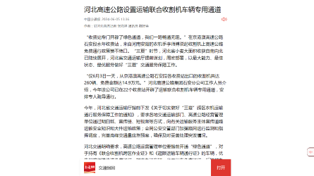 “收費站專門開辟了綠色通道,我們一路暢通無阻?!痹诰└郯母咚俟肥捕斡滥晔召M站,來自河南安陽的農機手李師傅說起收割機上高速公路免費通行政策贊不絕口。“三夏”時節(jié),河北省小麥大面積收獲自南向北已陸續(xù)展...[詳細]